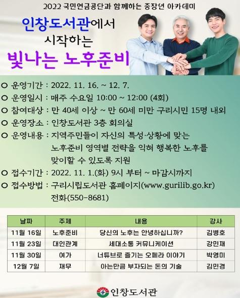 [한국뉴스타임=편집국] 구리시 인창도서관은 국민연금공단과 협력하여 11월 16일부터 12월 7일까지 『인창도서관에서 시작하는 빛나는 노후 준비』강좌를 운영한다.