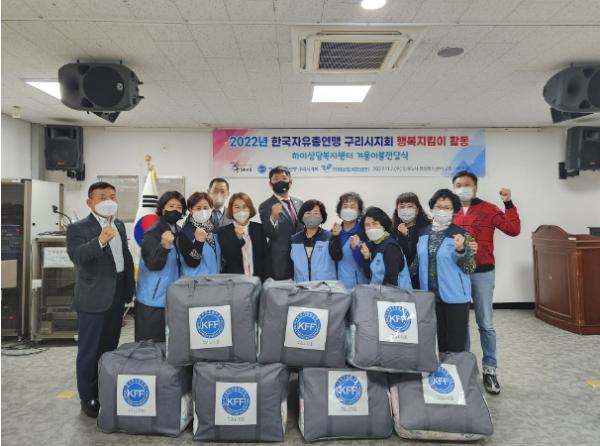 이날 전달식에는 이불 10채를 후원한 구리시 한국자유총연맹 김석진 회장과 회원들, 취약계층에 이불을 나눠주는 하이상담복지센터 민은희 센터장이 참석했다.