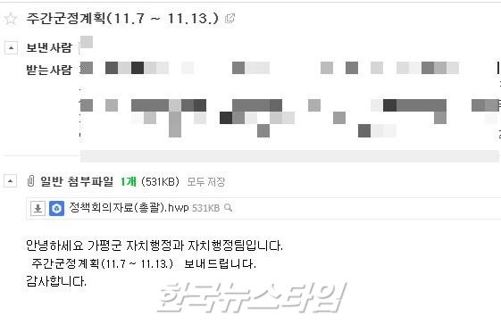 | ( 지난 4일 가평군청 자치행정과 자치행정팀 발신메일 캡처 ) |