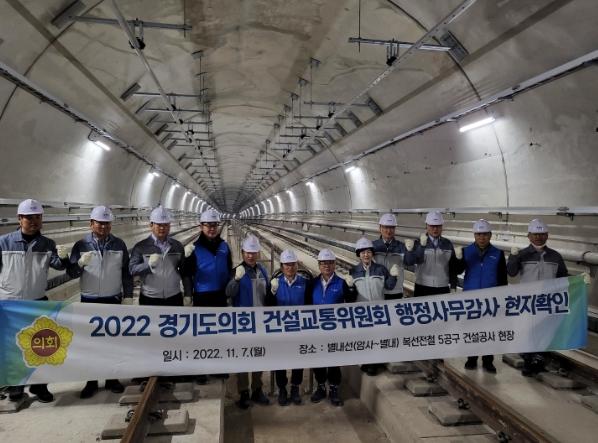 [한국뉴스타임=편집국] 경기도의회 건설교통위원회는 11월 7일 2022년 행정사무감사 기간 중 별내선(암사~별내) 복선전철 공사의 제5공구 현장을 방문해 사업의 전체 공정현황 및 운영계획, 경기도가 시행하는 3~6공구에 대한 공사 추진현황을 브리핑 받았다.