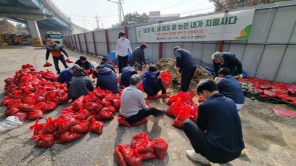[한국뉴스타임=편집국] 남양주시 금곡양정행정복지센터는 9일 ‘제320차 안전점검의 날’을 맞아 양정설해전진기지에서 겨울철 설해 대비를 위한 제설용 모래주머니 500여 개를 제작했다.