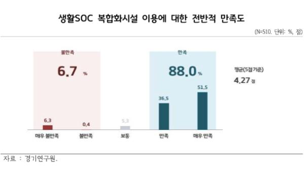 2022년 7월 15~27일 화성시 서연이음터, 파주시 중앙도서관, 오산시 보육타운(TOWN) 등 도내 3개 생활밀착형 사회기반시설(생활SOC) 복합화시설 이용자 510명을 대상으로 생활밀착형 사회기반시설(생활SOC) 복합화사업에 대한 정책만족도를 조사한 결과, 응답자의 88%가 시설 이용에 대해 만족한다고 응답했으며, 접근성과 이동 시간의 단축, 저렴한 이용료, 다양한 기능 및 프로그램의 연계성 등의 측면에서 높은 만족도를 보였다. 또한 응답자들의 92.7%는 생활밀착형 사회기반시설(생활SOC) 복합화시설 건립이 거주지역에서의 삶의 만족도를 높이는 데 기여한다고 응답했다.