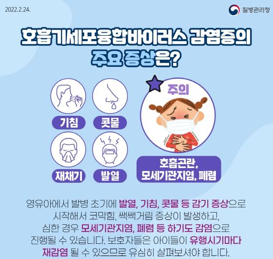 호흡기세포융합바이러스 감염증은 제4급 감염병인 급성호흡기감염증 중 하나로, 주요 발생 시기는 10월부터 3월까지이며 감염자의 분비물 접촉 또는 호흡기 비말을 통해 전파된다. 임상증상으로는 콧물과 인두염으로 시작해 1~3일 후 기침, 재채기, 미열, 천명 등이 있으며 영아에서 심한 경우 모세기관지염 또는 폐렴으로 진행된다.