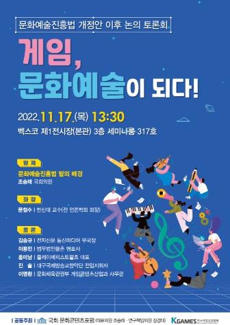 이번 토론회에서는 문화예술 범주에 게임을 포함시키는 내용의 '문화예술진흥법'개정안을 대표발의한 조승래 의원이 직접 발제자로 나서 법안 발의 배경과 통과 의의에 대해 발표한다.