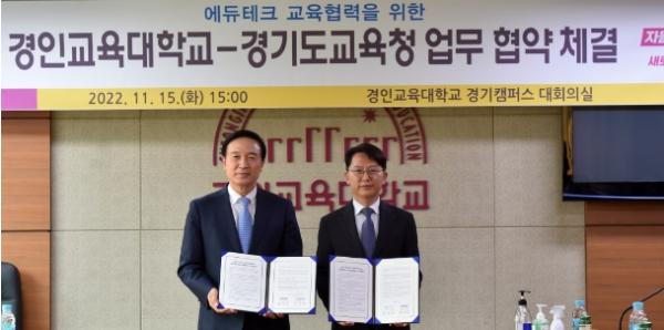 [한국뉴스타임=편집국] 경기도교육청이 15일 안양시 경인교육대학교에서 경인교육대학교(총장 김창원) 에듀테크 R&D(연구개발) 지원센터와 업무협약을 맺었다.