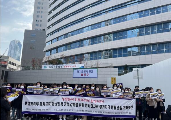[한국뉴스타임=편집국] 경기도의회 유호준 의원(더민주, 남양주6)이 지난 15일 11시 경기도청 입구에서 진행된 ‘여성가족부 폐지 저지와 국가 성평등 정책 강화’를 촉구하는 범시민사회 경기지역행동 출범 기자회견에 참석해 연대의 뜻을 밝혔다. 이번 경기지역행동 출범은 중앙정부의 여성가족부 폐지 움직임뿐만 아니라 경기도를 포함한 일부 지자체에서 ‘여성’, ‘성평등’을 부서명에서 삭제하는 안을 내거나 부서 폐지 예고, 관련 조례를 폐지 또는 개정을 추진하는 것을 저지하기 위한 움직임이기도 하다.