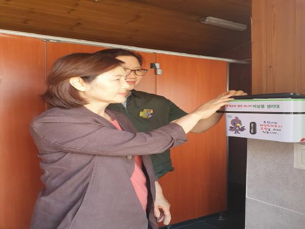 김영희 부의장은 지난 3일 필봉산 주차장 공중화장실에 방문해 위생용품(비상용 생리대)무료 지급기를 설치하고 현장을 확인하고 여성친화도시 조성에 만전을 기해 달라는 당부의 말을 남겼다.