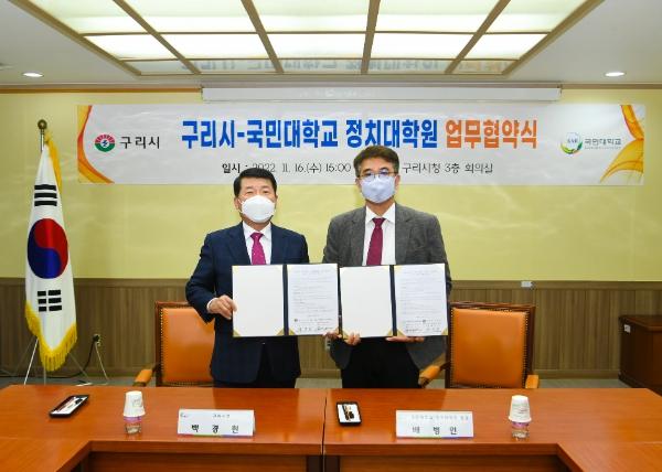 시와 국민대학교 정치대학원은 관학 협력의 일환으로 직무능력 향상을 위한 석사학위 과정 전문교육, 상호 현안 및 시책에 대한 자문 협조 등 상호교류, 구리시청 재직자에 대한 수업료 감면을 주요 골자로 협약을 체결했다.
