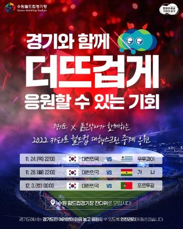 [한국뉴스타임=편집국] 경기도가 2022 카타르 월드컵 H조 한국 대표팀 경기가 열리는 24일, 28일, 12월 3일 수원월드컵경기장 주 경기장을 개방하는 시민응원전을 연다. 도는 도민들이 안전에 대한 염려를 내려놓고 즐겁게 응원할 수 있는 환경을 조성하기 위해 안전관리 요원 배치, 시민 동선 관리와 귀가 안내 등 꼼꼼한 안전대책 마련에 나섰다.