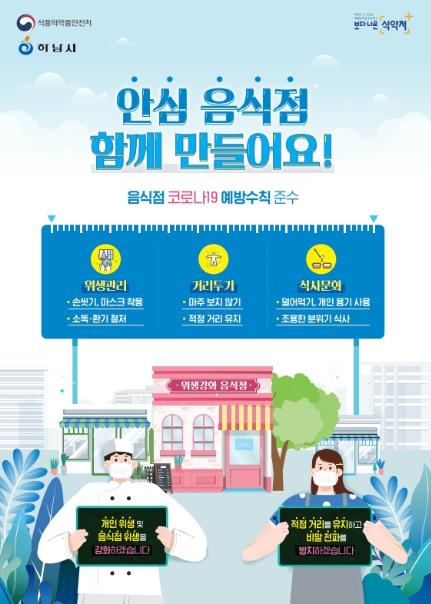 최윤식 식품위생과장은 “코로나19 감염 예방을 위해 음식점과 이용 손님 모두가 생활 속 거리두기 실천에 적극 동참해 주시기를 부탁드린다.”고 말했다.