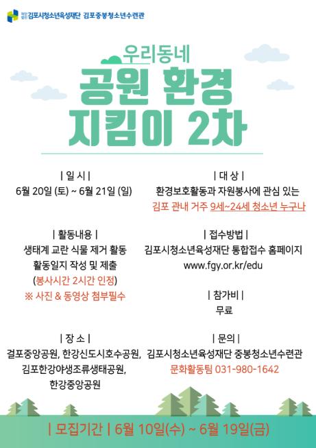 (재)김포시청소년육성재단 김포중봉청소년수련관은 코로나19의 장기화로 인해 제한된 청소년활동 참여를 대비해 오는 20일부터 21일까지 비대면 봉사활동인 ‘우리동네 공원 환경지킴이’ 프로그램 2차를 운영한다.