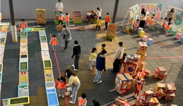 또한, 종이 박스, 플라스틱병, 비닐 등 우리 주변에서 흔히 볼 수 있는 폐재료를 활용해 놀이로 체험할 수 있는 팝업 놀이터 ‘업사이클링 놀이터’가 지난 24일부터 26일까지 3일간 총 21회 운영됐으며, 영유아들은 버려지는 재료들이 새활용된 놀잇감으로 소리, 촉감 등의 감각 체험과 박스 젠가, 고리 던지기, 뮤직 플레이 존 등 다양한 신체 활동 체험을 자율 놀이로 경험했다.
