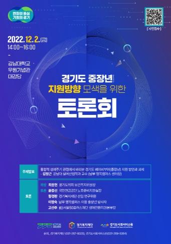 [한국뉴스타임=편집국] 경기도가 12월 2일 오후 2시 강남대학교 우원관 대강당에서 중장년(베이비부머) 지원 방향을 모색하기 위한 정책 토론회를 개최한다.