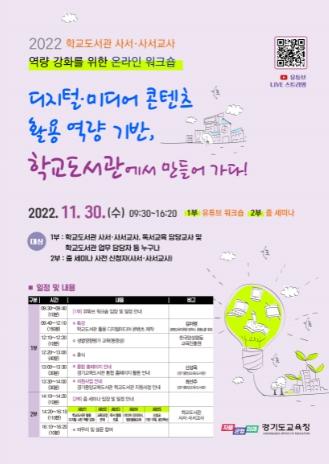 [한국뉴스타임=편집국] 경기도교육청은 30일 ‘디지털?미디어 콘텐츠 활용 역량 기반, 학교도서관에서 만들어가다!’라는 주제로 학교도서관 사서?사서교사 역량 강화를 위한 온라인 워크숍을 개최한다.