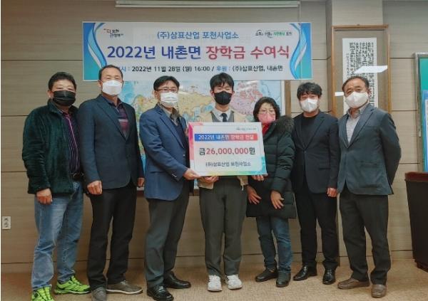 정진철 내촌면장은 “지역 인재육성을 위해 장학금을 전달해 주신 ㈜삼표산업 포천사업소 오홍석 대표님께 감사드린다. 우리 지역 학생들에게 희망찬 미래를 여는 힘이 될 것이다.”고 감사를 표했다.