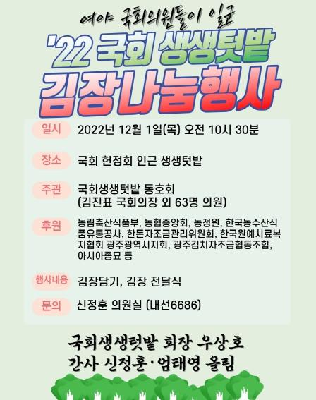 국회생생텃밭모임(회장 우상호, 간사 신정훈 엄태영)과 도시농업포럼(대표 류경오)은 2022년 국회텃밭 활동을 마감하는 폐장식과 함께 국회의원들이 담근 김치를 올여름 수해피해 지역 주민들과 소외계층, 일선 군장병 등에게 보내는 김장나눔행사를 갖는다.