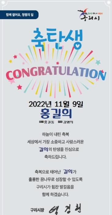 백경현 구리시장은 “새로운 생명 탄생을 축하하고, 빠르게 변화하는 시대흐름과 괴리되어 있는 정책들을 시대에 맞게 개편하여 시민들에게 필요한 서비스를 제공할 수 있도록 최선을 다하겠다.”고 전했다.