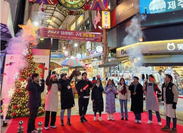 이날 행사는 구리전통시장 상인회 풍물패의 활기찬 식전 공연 후 강동호 구리시상권활성화재단 대표이사를 비롯한 권봉수 구리시의회 의장, 윤호중 국회의원, 이은주 경기도의회 의원 등 지역 인사들의 축사가 이어졌으며, 성광교회 어린이들의 캐롤 공연과 함께 플래시몹 퍼포먼스로 참가한 시민들에게 감동을 선사했다.