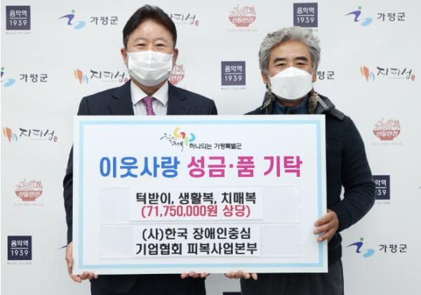 [한국뉴스타임=편집국] ‘한국 장애인중심 기업협회 피복사업본부’에서는 12월 5일 군수실에서 연말연시를 맞아 관내 어려운 이웃을 위해 써달라며 7,200만원 상당의 턱받이 2,500장, 생활복 1,270벌, 치매복 300벌을 군에 기탁하여 전달식을 가졌다.