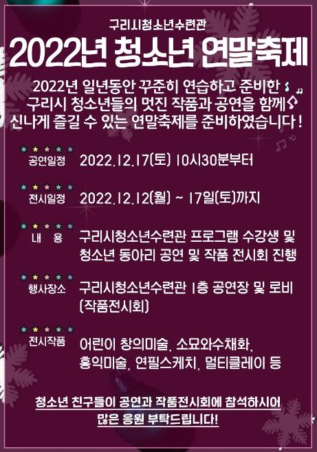[한국뉴스타임=편집국] 구리시청소년재단 구리시청소년수련관은 오는 12월 17일 오전 10시 30분부터 수련관 공연장에서 올 한해 청소년활동을 마무리하고, 2023년을 준비하고자 “2022 구리시청소년수련관 연말축제”운영할 예정이다.