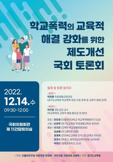 [한국뉴스타임=편집국] 경기도교육청이 14일 ‘학교폭력의 교육적 해결 강화를 위한 제도 개선 토론회’를 국회의원회관 제11간담회의실에서 개최한다.