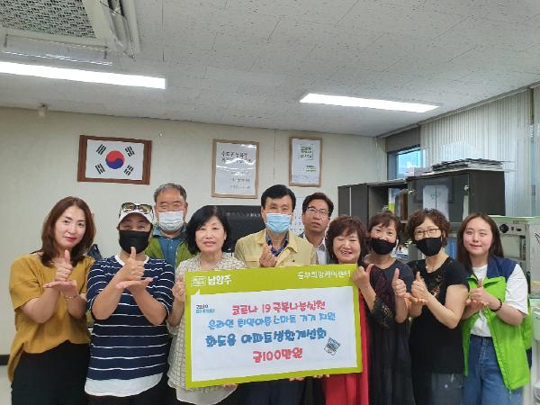 화도수동행정복지센터(센터장 박부영)는 지난 5일 화도읍 아파트생활개선회에서 코로나-19 성금 100만원을 동부희망케어센터에 기부했다고 밝혔다.