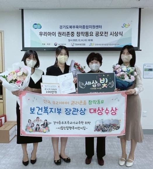[한국뉴스타임=편집국] 남양주시 진접읍에 소재한 경기동부보육교사교육원 위탁 시립진접행복어린이집은 2022년 『우리 아이 권리 존중 창작 동요』 공모전에서 대상에 해당하는 보건복지부장관상을 수상했다.