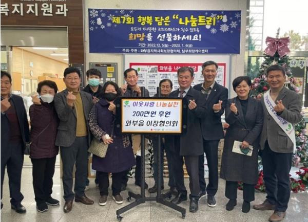 [한국뉴스타임=편집국] 남양주시 와부조안행정복지센터는 지난 9일 와부읍 이장협의회에서 지역 내 취약계층을 위해 ‘제7회 나눔트리’에 총 570만 원을 후원했다고 15일 밝혔다.