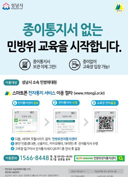 이용하려면 ‘민방위 전자통지센터(지역 성남시 선택→본인 인증)’ 웹사이트를 접속해 민방위 교육 훈련 통지서의 전자문서 송달 신청을 하면 된다.