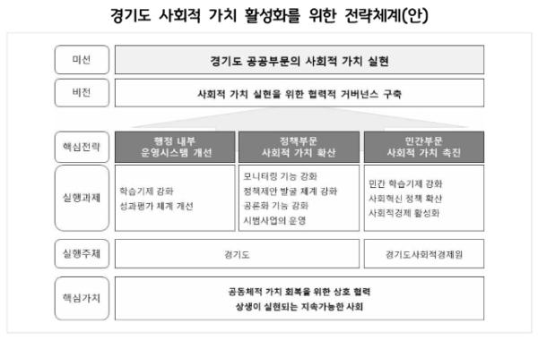 이에 함께 경기도 도정운영의 기본 가치로서 사회적 가치 중심의 패러다임 전환을 위한 중장기적 경기도 정부혁신 차원에서의 질적 전환 추진 전략으로 ▲중장기적 관점에서 행정 전반의 정부혁신 차원의 확장 ▲자치법규 등 제도적 기반 정비와 함께 실행체계 차원에서 전담부서의 위상을 재정립 등의 종합적 검토 ▲사회적 가치 중심의 전환과 지표개발 및 적용과정에서 사회적 공론화 ▲공공부문 및 민간부문을 연계와 사회적 가치 생태계 차원의 지원 등을 제시했다.