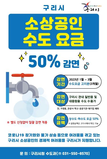 [한국뉴스타임=편집국] 구리시는 오는 2023년 1월부터 3월까지 한시적으로 소상공인 등 관내 수도 수용가에 대한 수도요금을 50% 감면하여 부과할 예정이다.
