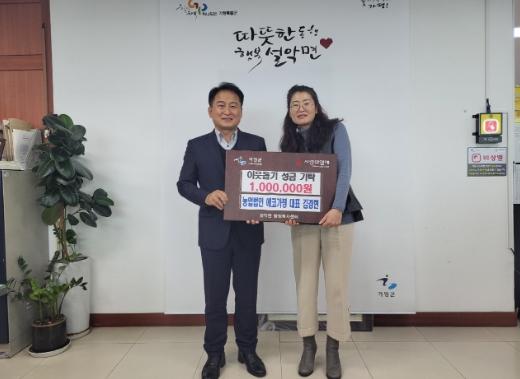 [한국뉴스타임=편집국] 농업법인 ㈜에코가평은 12월 20일 이웃돕기 성금 일백만원을 설악면행정복지센터를 방문하여 기탁했다.