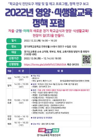 [한국뉴스타임=편집국] 경기도교육청이 22일 경기과학고등학교 컨벤션홀에서 영양ㆍ식생활교육 지원을 위한 정책 포럼을 개최한다.