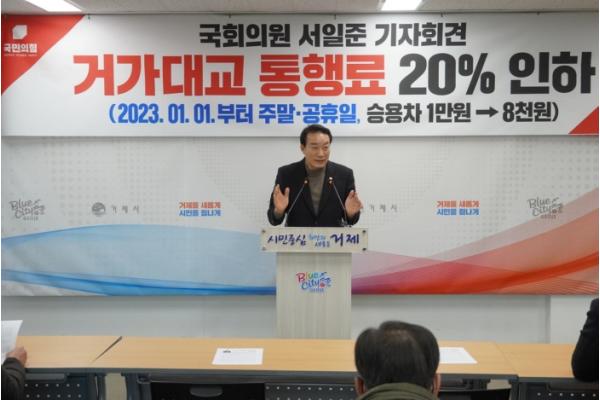 [한국뉴스타임=편집국] 서일준 국회의원(국민의힘, 거제)이 22일 거제시청 3층 브리핑룸에서 기자회견을 열고 내년 1월 1일부터 거가대로의 통행료가 주말과 공휴일에 20% 인하된다고 밝혔다.