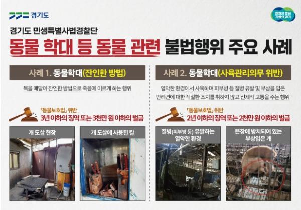 주요 위반사례를 보면 화성시 소재 A 농장주는 개를 도살하는 시설을 갖추고 밧줄을 이용해 쇠파이프봉에 개의 목을 매다는 잔인한 방법으로 죽음에 이르게 하는 작업을 하다 동물학대 혐의로 적발됐다.