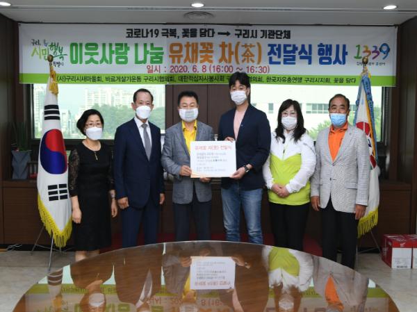 지난 8일 안승남 구리시장을 비롯한 기관단체 회장과 사무국장 그리고, 관내 업체로 이번 꽃차 만들기 아이디어와 재능을 기부한‘꽃을담다’이인표 대표 등이 함께한 가운데 유채꽃 차 10㎏(50g 파우치 200개 분량)을 취약계층에 공급하기 위한 단체 전달식을 가졌다.