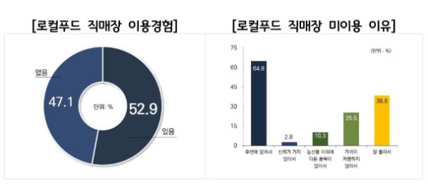 경기도민 가운데 로컬푸드를 인지하고 있는 도민의 비중은 77.3%에 달하지만 로컬푸드의 유통구조, 기능 등에 대해 알고 있는 도민의 비중은 39.6%에 불과했다. 로컬푸드 직매장을 이용해본 경험이 있는 도민 비중은 52.9%로 조사됐다. 로컬푸드 직매장을 이용하지 않은 이유는 주변에 없어서가 64.8%로 가장 높고, 그 다음은 잘 몰라서 38.6%, 가격이 저렴하지 않아서 25.5% 등 순이다. 로컬푸드 직매장에서 판매하는 농산물의 적정가격에 대해 경기도민의 64.9%가 대형마트 가격 대비 90% 이하 수준으로 응답했다. 로컬푸드 직매장에서 판매하는 농산물의 안전기준에 대해서는 유기농 20.5%, 무농약 이상 25.0%, 우수관리인증(GAP) 이상 42.5%, 일반농산물 7.1% 등으로 응답했다. 경기도민 가운데 91.9%가 경기도 차원의 로컬푸드 직매장 인증제가 필요하다고 했다.