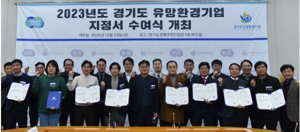 ‘2023년 경기도 유망환경기업’으로 지정된 기업은 신규지정은 ▲주식회사 세림비앤지 ▲주식회사 솔브 ▲영진아이엔디(주) ▲하이코어 주식회사 ▲코스코페이퍼(주) ▲이앤에이치(주) ▲주식회사 네오디아 ▲케비환경기술㈜ ▲한국바이오플랜트(주) ▲케이원에코텍(주) 등 10개사, 재지정은 ▲주식회사 지온 ▲㈜쓰리에이씨 ▲(주)로스웰워터 ▲굿바이카(주) ▲빛나매크로(주) 등 5개사로 총 15개사이다.