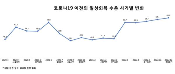 코로나19 이전의 일상을 얼마나 회복했는가를 0점(완전 정지)에서 100점(완전회복)까지 제시하고 표시하도록 질문한 결과, 경기도민의 현재 일상회복 수준은 평균 65.8점으로, 동일 문항을 적용한 지난 조사 중 가장 높은 점수를 기록했다. 2022년 1월 47.2점까지 낮아졌다가 점점 상승세다.