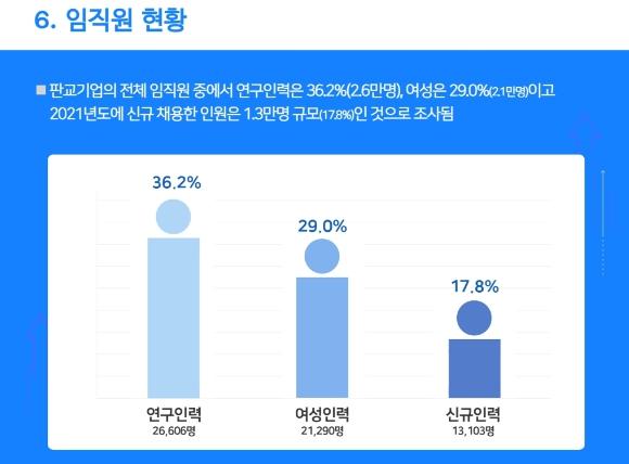 상시 근무하는 노동자 수는 7만3,443명으로 전년 7만1,967명 대비 2.0% 증가했다. 주요 연령대는 30~40대가 4만9,653명으로 67.6%를 차지하고 있다. 판교테크노밸리 전체 임직원 중 연구인력은 36.2%(2만6,606명), 여성인력은 28.9%(2만1,290명), 신규인력은 17.8%(1만3,103명)으로 모두 전년도 대비 비중이 증가(여성인력 1.2%, 연구인력 1.6%, 신규인력 1.6%)한 것으로 확인됐다.