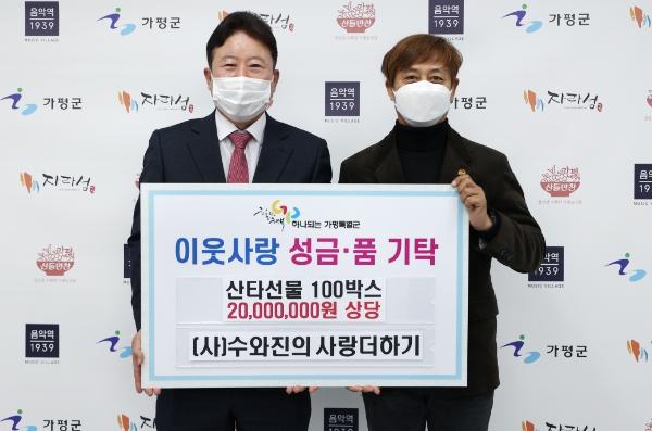 한편, (사)수와진의 사랑더하기는 지난해에도 산타 선물 100세트를 기탁하는 등 2년 연속 가평군에 따뜻한 이웃사랑을 이어오고 있고, 2022년 10월 20일에 수와진은 가평군 홍보대사로 위촉된바 있다.