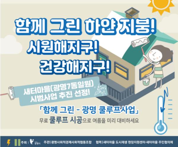 한편, 함께 그린 광명 쿨루프사업은 2019년 광명시가 환경부에 제안하여 선정된 사업으로 사업비는 240백만원(국비 50%, 시비 50%)이다. 7월 초까지 쿨루프 시공을 마치고 여름철 에너지효율을 모니터링할 계획이며, 9월에 하얀 쿨루프옥상 문화제를 개최하여 성과 보고할 예정이다.