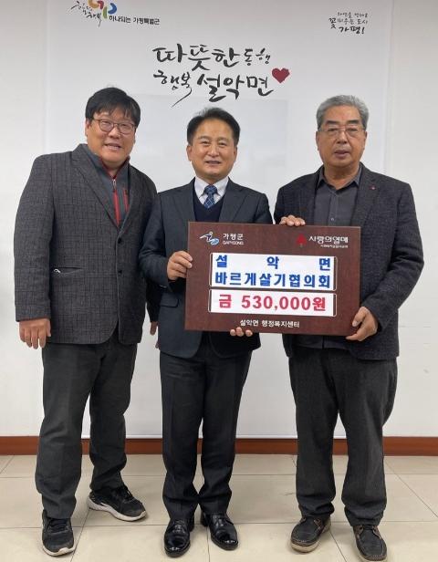 이에 이범주 설악면장은 “매해 다양한 활동을 통해 지역사회복지증진에 힘써주시는 설악면 바르게살기운동 협의회에 감사드린다. 기탁된 성금은 관내 어려운 이웃들이 따뜻한 겨울을 보낼 수 있도록 잘 전달하겠다. 또한 23년에도 따뜻한 동행 행복 설악면을 만들어 나갈 수 있도록 많은 활동을 부탁드린다”고 전했다.