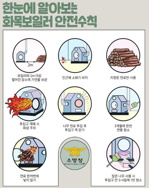 화목보일러 안전수칙 ▲보일러와 2m 이상 떨어진 장소에 가연물 보관 ▲인근에 소화기 비치 ▲지정된 연료만 사용 ▲투입구 개폐 시 화상 주의 ▲나무 연료 투입 후 투입구 꼭 닫기 등이다.