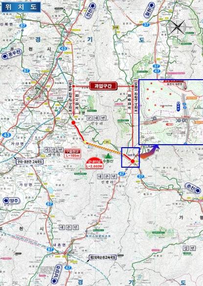 ‘포천 군내-내촌 국지도 개량 사업’은 포천시 군내면 직두리부터 내촌면 신팔리를 연결하는 5.5km 2차로 선형을 개량하는 사업으로, 총사업비 1,026억원이 투입된다. 동 사업은 지난 2021년 착공하여 벌목 및 보상 작업을 거쳐 현재 약 1%의 공정률(1월 기준)을 보이고 있으며, 오는 2028년 12월경 준공될 예정이다.