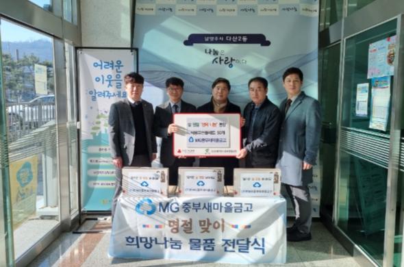 [한국뉴스타임=편집국] MG중부새마을금고는 11일 설 명절을 앞두고 남양주시 다산2동의 취약계층을 지원하기 위해 식용유 50세트(100만 원 상당)를 다산2동 지역사회보장협의체에 전달했다.
