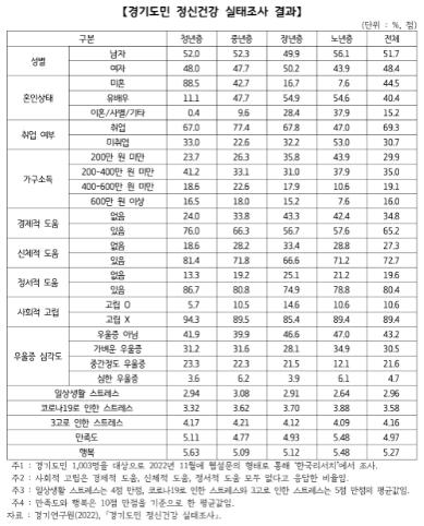 경기연구원은 2020년 9월 22일~11월 15일 경기도에 거주하는 1만 6천 가구 3만 3천677명을 대상으로 한 ‘경기도민 삶의 질 조사’와 2022년 11월에 경기도민 1천3명을 대상으로 ‘경기도민 정신건강 실태조사’ 내용을 담은 ‘소외된 중장년층에게 관심을 가져야 할 때’ 보고서를 발간했다고 12일 밝혔다.