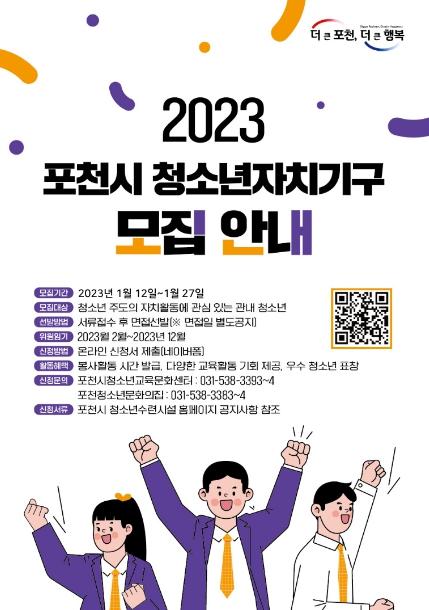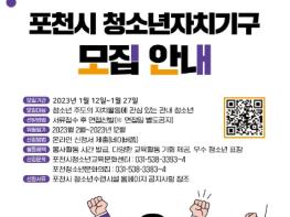 [한국뉴스타임=편집국] 포천시 공공 청소년수련시설(포천시청소년교육문화센터, 포천청소년문화의집)은 청소년들의 자기주도적인 사회참여를 통해 지역사회 발전과 민주시민으로 성장할 수 있는 기회를 제공하기 위해 운영되고 있다. 1월 12일(목)부터 27일(금)까지 ‘2023년 청소년자치기구’ 참가 청소년을 모집한다.