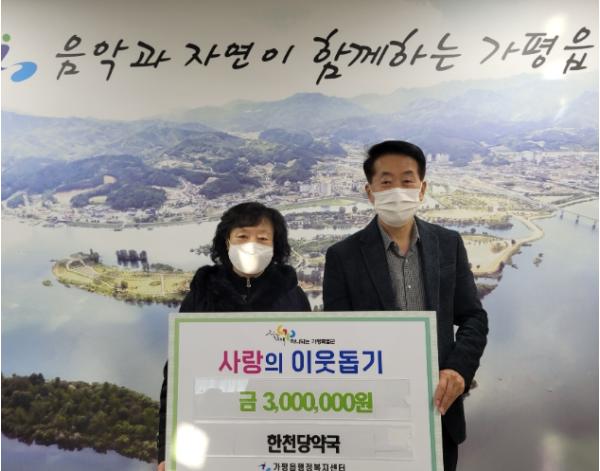 [한국뉴스타임=편집국] 한천당약국은 2023년 1월 11일(수) 오전 가평읍행정복지센터 맞춤형복지팀에 사랑의 이웃돕기 성금 300만원을 전달했다.