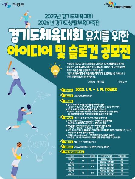 1월 10일 경기도종합체육대회 유치추진단을 출범한 가평군은 출범에 앞서 체육대회의 유치 추진에 대한 군민들의 관심을 유도하기 위해 1월 9일부터 아이디어 및 슬로건 공모전을 추진했다. 공모 주제는 가평군의 민선 8기 비전과 부합하는 경기도체육대회 유치 아이디어 또는 체육대회에 활용할 슬로건(비장애인/장애인 체육대회 각각 모집)을 제안하는 것으로, 가평군민 뿐만 아니라 전 국민 누구나 참여 가능하다.